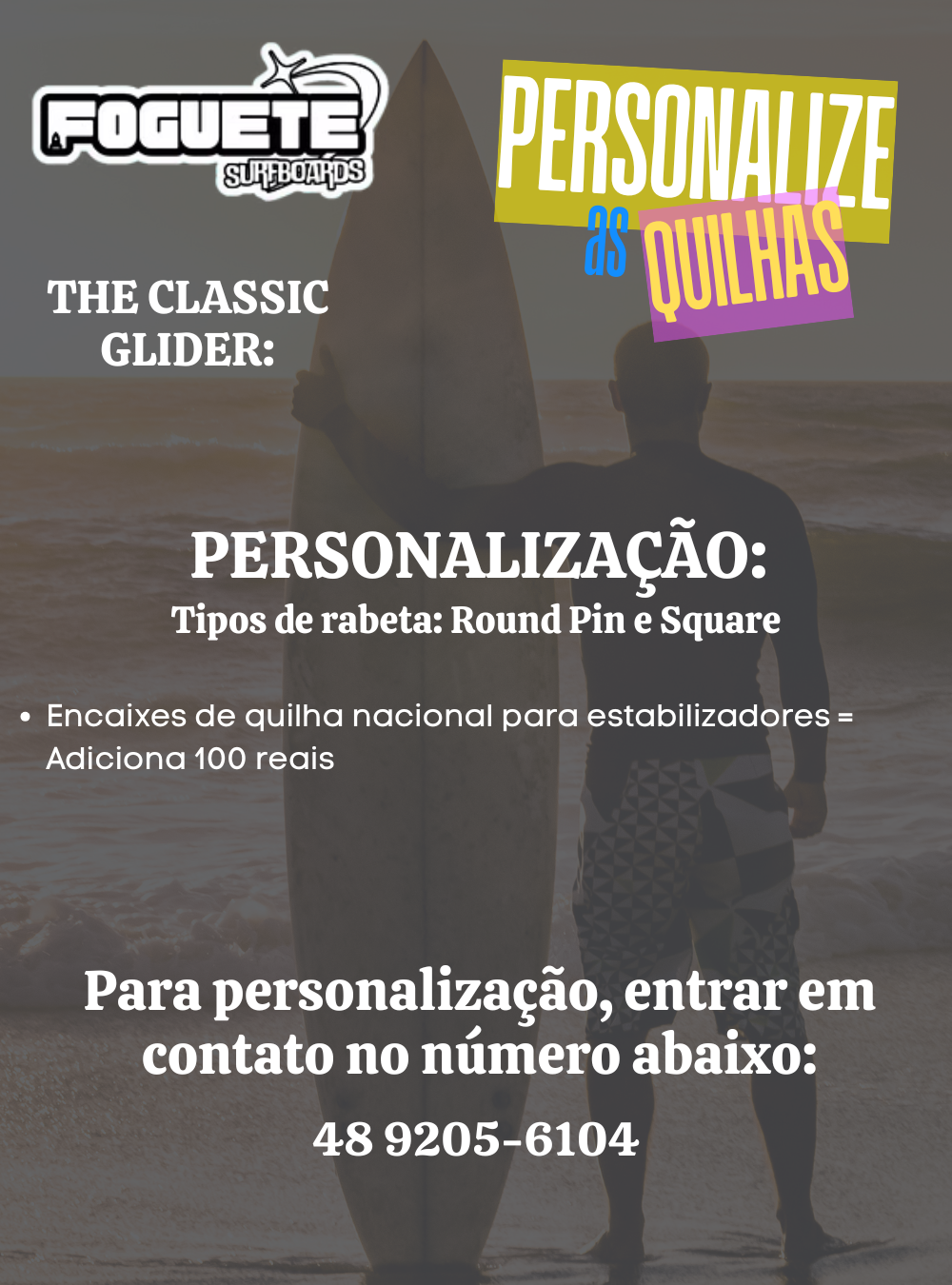 THE CLASSIC GLIDER Longboard de Performance com Fluidez Total O Longboard redefinido. A THE CLASSIC GLIDER Rabeta Round é o equilíbrio perfeito entre a remada imbatível do clássico e o drive fluído e controlado de uma prancha de alta performance. Este modelo, o 91" LONG PERFORMER ROUND, é uma máquina projetada para surfar a onda inteira. A rabeta Round e o outline afilado garantem que você tenha velocidade, sustentação e a capacidade de fazer curvas longas e suaves, típicas do Longboard moderno. Por Que A Rabeta Round É Essencial - Controle e Fluidez A Rabeta Round garante que a prancha segure a linha em alta velocidade e facilita a transição de borda em curvas amplas e controladas. - Deslize e Velocidade O volume a partir de 70.65 L na 91" e o rocker ajustado maximizam o deslize gliding e o trim. - Nose Riding com Segurança O bico largo e a rabeta que "segura" a onda oferecem estabilidade para o nose riding e para o pop-up. - Dimensões de Performance A 91" tem uma largura de 22 78 e espessura de 2 1516, equilibrando flutuação com a necessidade de engajamento da borda. Opções com pintura em até duas cores. Fale com o nosso departamento de vendas.